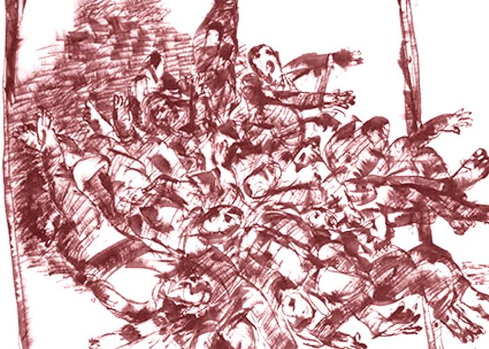 الدماء التي تلون وجه ولده، تشد جفنيه المرتعشين للنظر باستمرار، تابعت عيناه الأقدام التي تتدافع فوق جسد ولده الذي بدأ يتحول إلى كتلة لحم مشوهة تغمرها الدماء، يختلج جسده، يحاول إبعاد المنظر من أمام عينيه، يوده أن يتحول إلى كابوس وتأتي لحظة اليقظة التي ترغمه على الرحيل إلى اللانهاية، يقترب كبيرهم، يقدم له سيكارة، يمسكها بيده المرتعشة، يمتص منها أكبر قدر ممكن من الدخان، يبتسم الرجل وهو يضع مجموعة من الأوراق أمامه: