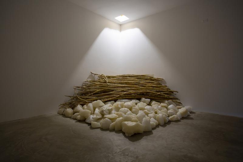في تجهيز حمل عنوان «آه، جميلتي فينوس»، اختصر ريان ثابت رحلة المنحوتة البازلتية من الكتلة إلى الشظايا (الكشف الأثري المركزي للمستكشف الألماني أوبنهايم)، يريد ثابت أن يقول “ما بعد” انتهاء ولع العين القديمة، وما يعقب تشظي الغنيمة الاستعمارية، لأجل لملمة صيغة أصلية مشتهاة، عبر قوالب ونسخ، تحكي الانتقال من الكتلة إلى الفتات، شيء شبيه برحلة الخرائط في من المدى المتدفق إلى الأسيجة: أقنعة غير مكتملة لما يشبه تمثال فينوس بعد تشطيرها، ونقلها إلى ما بعد التكوين، وما بعد الاكتمال، قطعٌ متنابذة، لا تجد معناها إلا في العين القديمة، الهادية، وكأن الناظر أمام قطع “بازل” هي السطح والعمق والتكوين إنما خارج النسق الناظم.