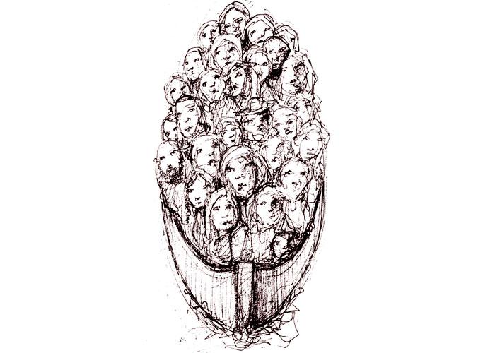 تَسْتَقْتِلُونَ‭ ‬عَلَى‭ ‬القَوَارِبِ،‭ ‬وَيَبْتَلِعُكُمُ‭ ‬البَحْرُ‭ ‬دُونَ‭ ‬لِسْبُوسْ،‭ ‬وأَمُوتُ‭ ‬فِي‭ ‬صِقِلِّيَّةَ‭ ‬هَارِبَةً‭ ‬مِنَ‭ ‬الْبَيتِ‭.‬‭ ‬لَا‭ ‬تُصَدِّقُوا‭ ‬بُوسِيدُونَ،‭ ‬ولَا‭ ‬قَارِبَ‭ ‬عُولِيسَ‭. ‬لَا‭ ‬تُصَدِّقُوا‭ ‬الرَّسَائِلَ‭ ‬ولَا‭ ‬تُصَدِّقُوا‭ ‬الْكَلِمَاتِ‭. ‬لَمْ‭ ‬يَبْقَ‭ ‬مِنْ‭ ‬قُدْمُوسَ‭ ‬الهَارِبِ‭ ‬بِشَقِيقَتِهِ‭ ‬مِنْ‭ ‬صُوْرِ‭ ‬الْمُحْتَرِقَةِ‭ ‬سِوَى‭ ‬حُطَامٍ‭ ‬فِي‭ ‬قَارِبٍ‭.‬